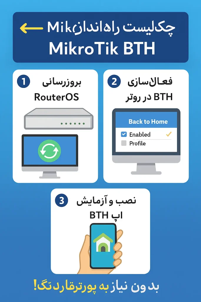 حتماً! در ادامه یک مقاله‌ی کامل، آموزشی و به زبان فارسی درباره‌ی قابلیت MikroTik Back To Home (BTH) آماده کرده‌ام. این مقاله هم برای کاربران تازه‌کار و هم برای افراد حرفه‌ای در حوزه‌ی شبکه کاربردی است.